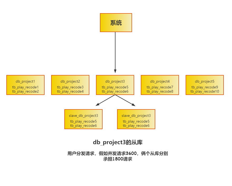 这个时候就需要使用播放记录表的自增ID进行取模5,比如每天播放记录新增100W数据。此时20W数据会落到db_project1的db_play_recode1,其它的四个库分别也会落入20W数据。