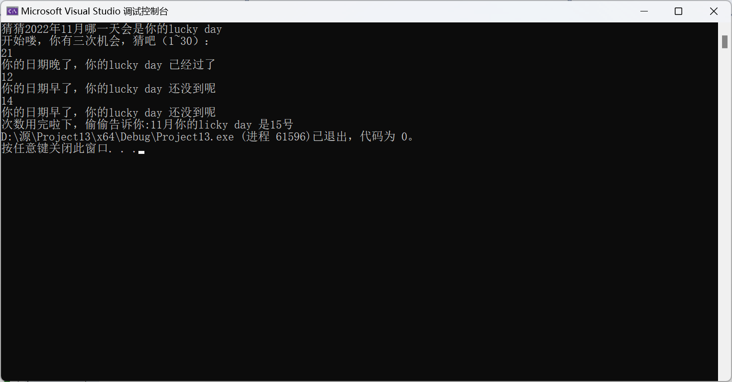 printf("猜猜2022年11月哪一天会是你的lucky day\n开始喽,你有三次机会,猜吧(1~30):\n");