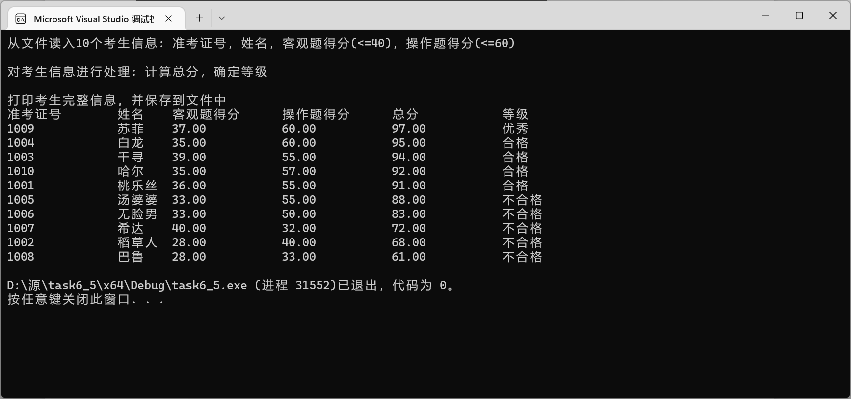 // 从文本文件examinee.txt读入考生信息:准考证号,姓名,客观题得分,操作题得分