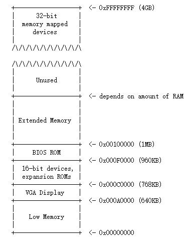 在执行上一步的call指令后,可以看到代码段已经执行到了0x00100000+再观察之前的物理地址空间图,此处为extended memory,再观察bootmain中的源码,这是之前bootloader的目标地址,故我认为此处call指令为bootloader的最后一条指令。