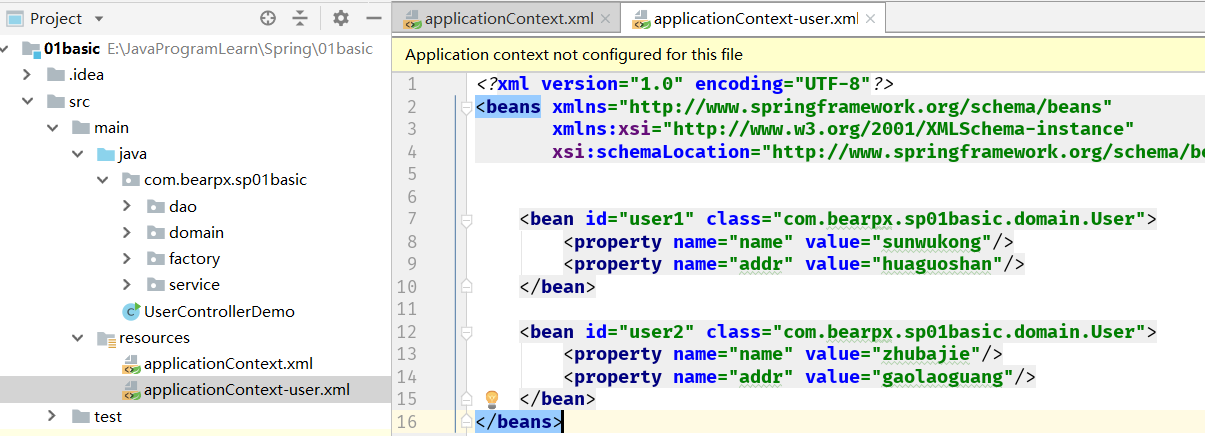 <bean id="user1" class="com.bearpx.sp01basic.domain.User"> <property name="name" value="sunwukong"/> <property name="addr" value="huaguoshan"/> </bean> <bean id="user2" class="com.bearpx.sp01basic.domain.User"> <property name="name" value="zhubajie"/> <property name="addr" value="gaolaoguang"/> </bean>