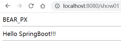 <!DOCTYPE HTML PUBLIC "-//W3C//DTD HTML 4.01 Transitional//EN" "http://www.w3.org/TR/html4/loose.dtd"> <html xmlns:th="http://www.thymeleaf.org"> <head> <title>BEAR PX</title> </head> <body> <span th:text="BEAR_PX">NEW</span> <hr> <span th:text="${msg}"></span> </body> </html>