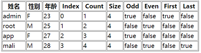 <table border="1" width="50%"> <tr> <th>姓名</th> <th>性别</th> <th>年龄</th> <th>Index</th> <th>Count</th> <th>Size</th> <th>Odd</th> <th>Even</th> <th>First</th> <th>Last</th> </tr> <tr th:each="u, state : ${listUsers}"> <td th:text="${u.userName}"></td> <td th:text="${u.sex}"></td> <td th:text="${u.age}"></td> <td th:text="${state.index}"></td> <td th:text="${state.count}"></td> <td th:text="${state.size}"></td> <td th:text="${state.odd}"></td> <td th:text="${state.even}"></td> <td th:text="${state.first}"></td> <td th:text="${state.last}"></td> </tr> </table>