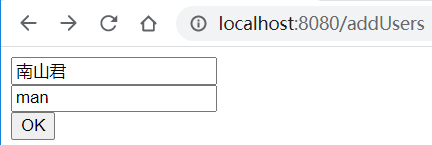 <html xmlns:th="http://www.thymeleaf.org"> <head> <title>新增用户</title> </head> <body> <form th:action="@{/user/addUser}" method="post"> <input type="text" name="username"><br/> <input type="text" name="usersex"><br/> <input type="submit" value="OK"> </form> </body> </html>