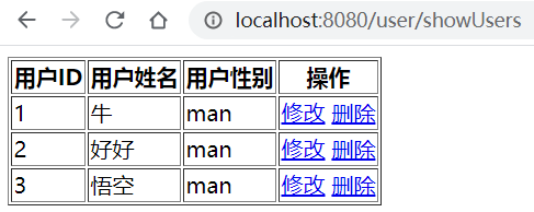 <body> <table border="1px"> <tr> <th>用户ID</th> <th>用户姓名</th> <th>用户性别</th> <th>操作</th> </tr> <tr th:each="u: ${list}"> <td th:text="${u.userid}"></td> <td th:text="${u.username}"></td> <td th:text="${u.usersex}"></td> <td> <a th:href="@{/user/preUpdateUser(id=${u.userid})}">修改</a> <a th:href="@{/user/deleteUser(id=${u.userid})}">删除</a> </td> </tr> </table> <a href="/addUsers">新增用户</a> </body>