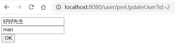 <body> <form th:action="@{/user/updateUser}" method="post"> <input type="hidden" name="userid" th:value="${user.userid}"> <input type="text" name="username" th:value="${user.username}"><br/> <input type="text" name="usersex" th:value="${user.usersex}"><br/> <input type="submit" value="OK"> </form> </body>