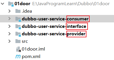 interface模块是提供provider要实现的接口和domain类, provider模块是服务提供者, 实现interface接口的功能, consumer模块是服务消费者,调用provider提供的服务。