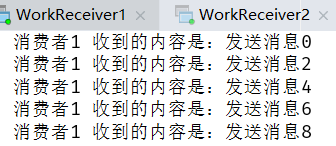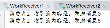 public class WorkReceiver1 { private final static String QUEUE = "testWork"; public static void main(String[] args) throws IOException, TimeoutException { Connection connection = ConnectionUtil.getConnection(); final Channel channel = connection.createChannel(); channel.queueDeclare(QUEUE, false, false, false, null); // 告诉服务器,在没有确认当前消息完成之前,不要发送新的消息 channel.basicQos(1); // 接收消息 DefaultConsumer consumer = new DefaultConsumer(channel){ @Override public void handleDelivery(String consumerTag, Envelope envelope, AMQP.BasicProperties properties, byte[] body) throws IOException { System.out.println("消费者1 收到的内容是:" + new String(body)); try { Thread.sleep(10); } catch (InterruptedException e) { e.printStackTrace(); } // 确认 channel.basicAck(envelope.getDeliveryTag(),false); } }; // 注册消费者, 参数2:手动确认,代表收到消息后需要手动告诉服务器,收到消息了。 channel.basicConsume(QUEUE,false,consumer); } }