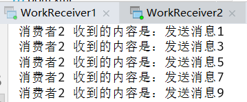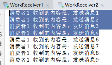 public class WorkSender { private final static String QUEUE = "testWork"; public static void main(String[] args) throws IOException, TimeoutException { Connection connection = ConnectionUtil.getConnection(); Channel channel = connection.createChannel(); channel.queueDeclare(QUEUE, false, false, false, null); // 发送内容 for(int i = 0; i< 10; i++){ channel.basicPublish("",QUEUE,null,("发送消息" + i).getBytes()); } channel.close(); connection.close(); } }