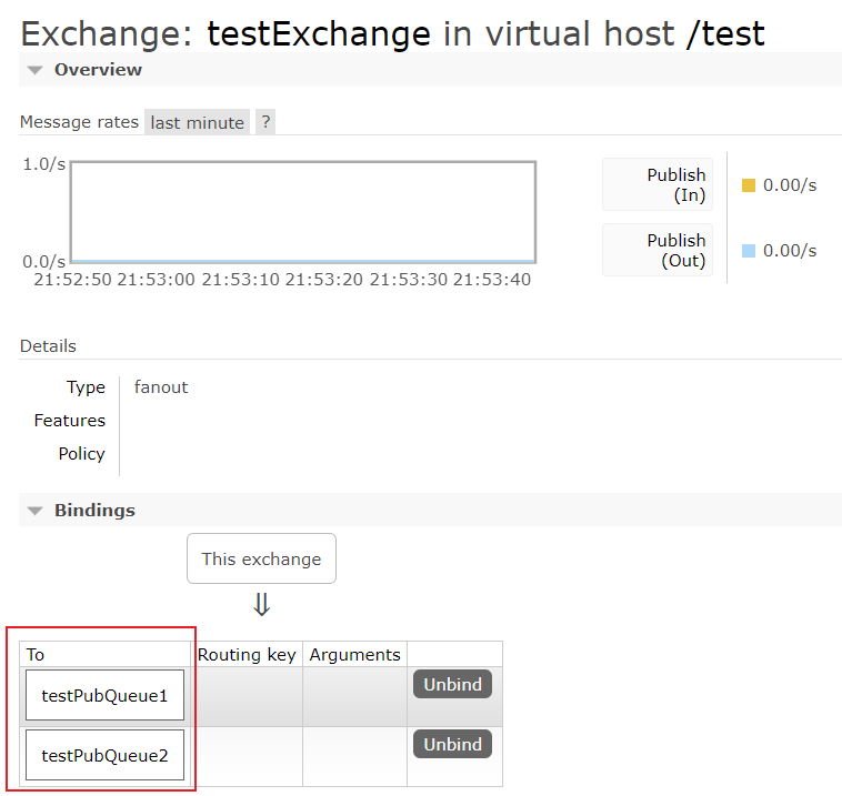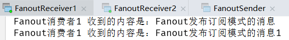 public class FanoutSender { private final static String EXCHANGE_NAME = "testExchange"; public static void main(String[] args) throws IOException, TimeoutException { Connection connection = ConnectionUtil.getConnection(); Channel channel = connection.createChannel(); // 声明交换机, 类型为fanout channel.exchangeDeclare(EXCHANGE_NAME, "fanout"); // 发布订阅模式,消息先发到交换机,交换机没有保存功能,如果没有消费者,消息会丢失 channel.basicPublish(EXCHANGE_NAME,"",null,"Fanout发布订阅模式的消息1".getBytes()); // 关闭连接 channel.close(); connection.close(); } }