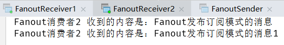 public class FanoutReceiver1 { private final static String EXCHANGE_NAME = "testExchange"; public static void main(String[] args) throws IOException, TimeoutException { Connection connection = ConnectionUtil.getConnection(); final Channel channel = connection.createChannel(); // 声明队列 channel.queueDeclare("testPubQueue1", false, false, false, null); // 绑定队列到交换机 channel.queueBind("testPubQueue1", EXCHANGE_NAME, routingKey:""); channel.basicQos(1); DefaultConsumer consumer = new DefaultConsumer(channel){ @Override public void handleDelivery(String consumerTag, Envelope envelope, AMQP.BasicProperties properties, byte[] body) throws IOException { System.out.println("Fanout消费者1 收到的内容是:" + new String(body)); channel.basicAck(envelope.getDeliveryTag(),false); } }; channel.basicConsume("testPubQueue1",false,consumer); } }