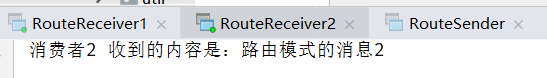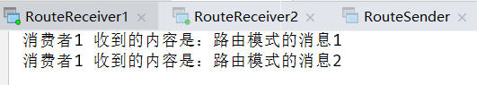public class RouteSender { private final static String EXCHANGE_NAME = "testRoute"; public static void main(String[] args) throws IOException, TimeoutException { Connection connection = ConnectionUtil.getConnection(); Channel channel = connection.createChannel(); // 声明交换机, 类型为fanout channel.exchangeDeclare(EXCHANGE_NAME, "direct"); // 路由模式 channel.basicPublish(EXCHANGE_NAME,"key1",null,"路由模式的消息1".getBytes()); channel.basicPublish(EXCHANGE_NAME,"key2",null,"路由模式的消息2".getBytes()); // 关闭连接 channel.close(); connection.close(); } }