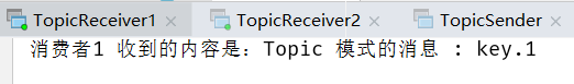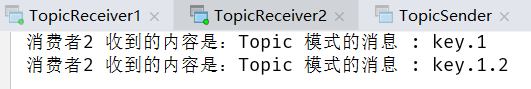 public class TopicSender { private final static String EXCHANGE_NAME = "testTopic"; public static void main(String[] args) throws IOException, TimeoutException { Connection connection = ConnectionUtil.getConnection(); Channel channel = connection.createChannel(); channel.exchangeDeclare(EXCHANGE_NAME, "topic"); channel.basicPublish(EXCHANGE_NAME,"key.1",null,"Topic 模式的消息 : key.1".getBytes()); channel.basicPublish(EXCHANGE_NAME,"key.1.2",null,"Topic 模式的消息 : key.1.2".getBytes()); channel.close(); connection.close(); } }
