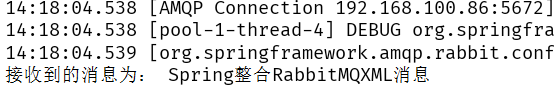 public class SpringTest { public static void main(String[] args) { ApplicationContext context = new ClassPathXmlApplicationContext("rabbitmq.xml"); RabbitTemplate template = context.getBean(RabbitTemplate.class); template.convertAndSend("Spring整合RabbitMQXML消息"); ((ClassPathXmlApplicationContext) context).destroy(); } }