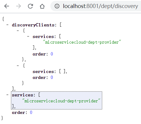 (7.3)测试: 先启动Eureka Server, 再启动服务提供者,访问http://localhost:8001/dept/discovery