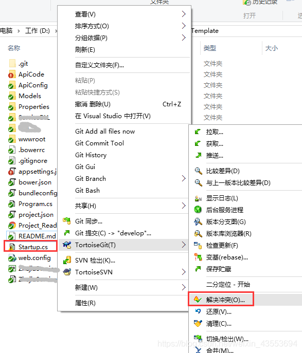 4、确定后可能会提示有错误,这是需要解决冲突,右键 “解决冲突”