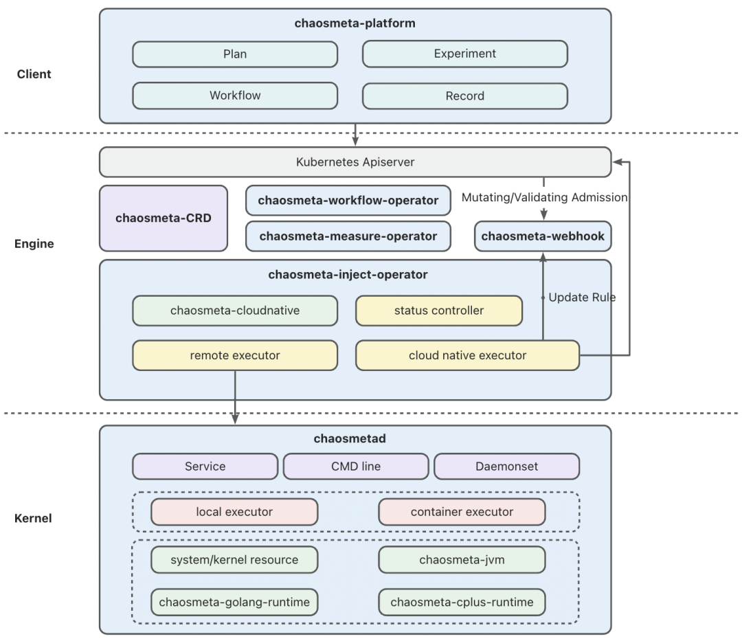 ChaosMeta 的核心平台能力是基于 Operator 开发模式实现的,因此天然支持云原生。ChaosMeta 分为三层设计,详见官方文档: