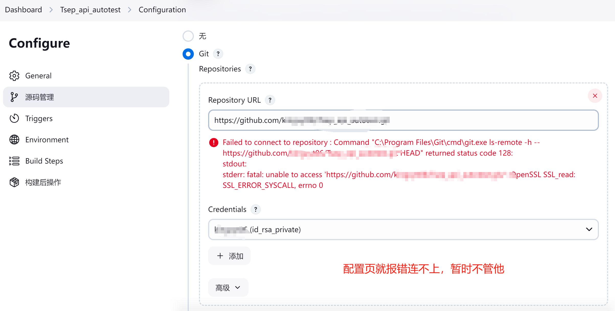 任务里面的配置项问题,填写了git地址后,一直报错连接不上,后面倒腾了一次那个凭据,总算是正常了
