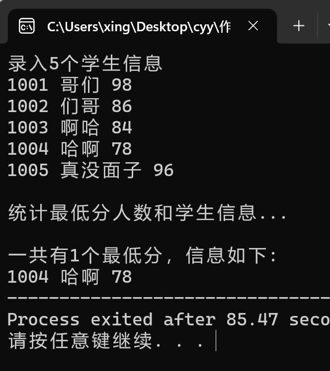 printf("\n统计最低分人数和学生信息...\n");