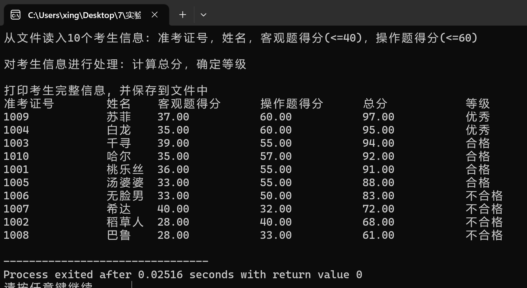 printf("\n打印考生完整信息, 并保存到文件中");