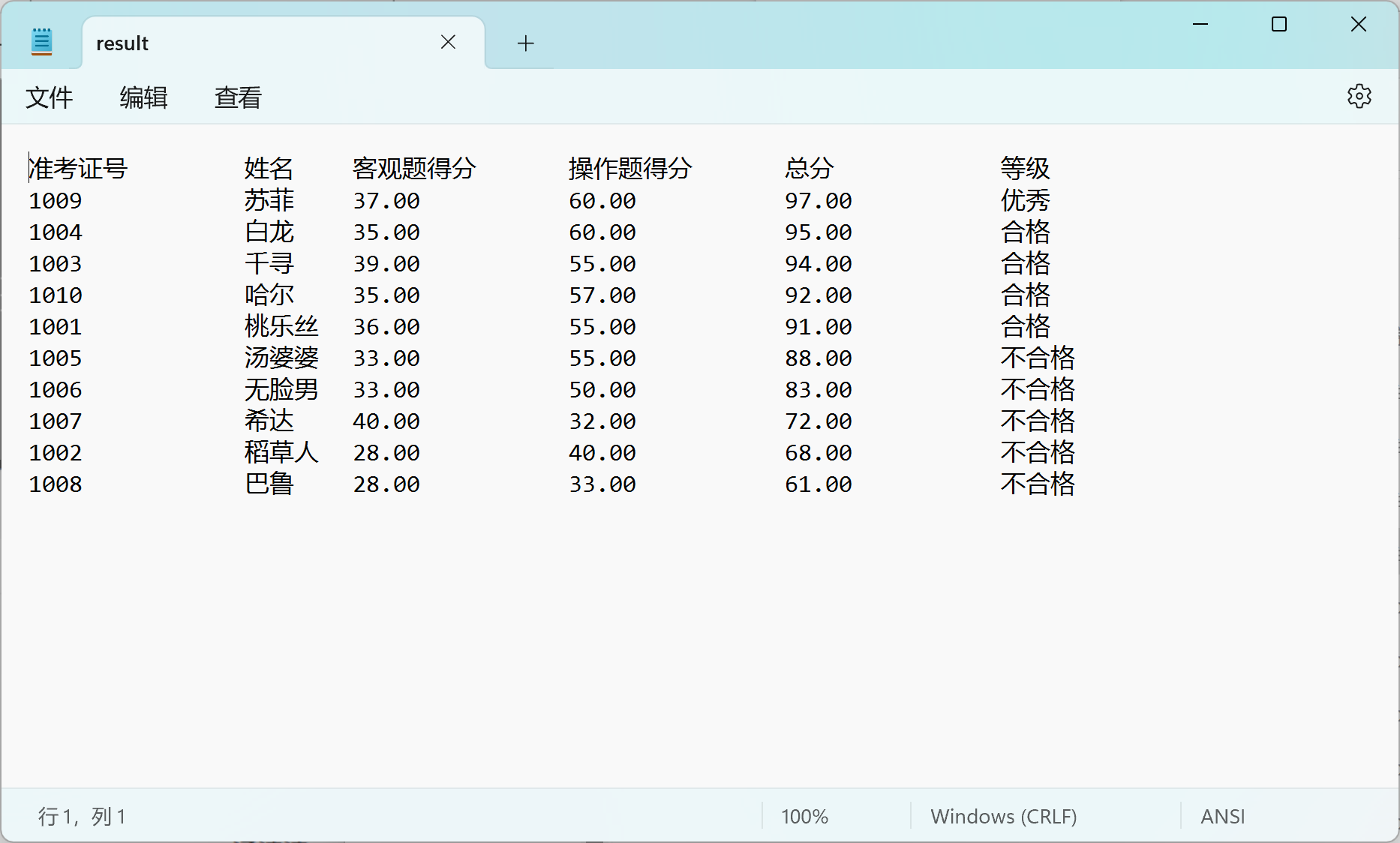fprintf(fout, "准考证号\t\t姓名\t客观题得分\t操作题得分\t总分\t\t等级\n");