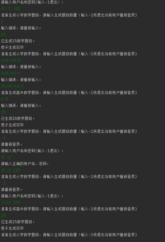 3、题目数量的有效输入范围是“10-30”(含10,30,或-1退出登录),程序根据输入的题目数量生成符合小学、初中和高中难度的题目的卷子(具体要求见附表)。同一个老师的卷子中的题目不能与以前的已生成的卷子中的题目重复(以指定文件夹下存在的文件为准,见5);
