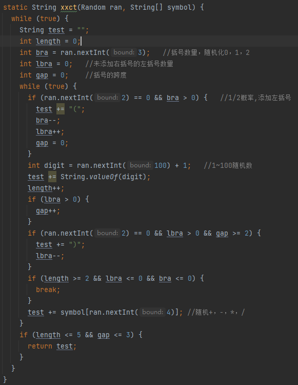 三个方法均采用对String进行多次增添修改来生成完整的数学表达式题目,对String的多次修改可使用Stringbuilder类更易于操作