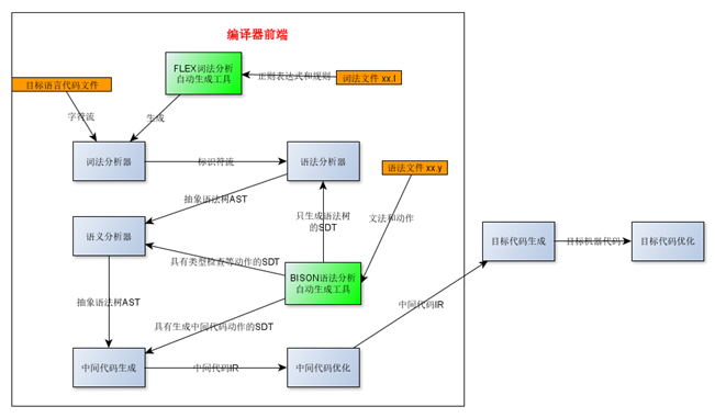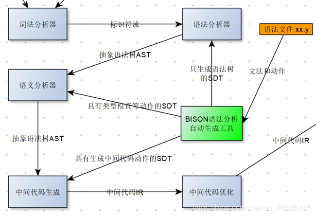 对于语法分析的生成工具Bison来说,只需要给它一个目标语言的上下文无关文法和相应的语法制导翻译方案SDT,它就能生成该目标语言的语法分析部分到IR生成部分的程序。