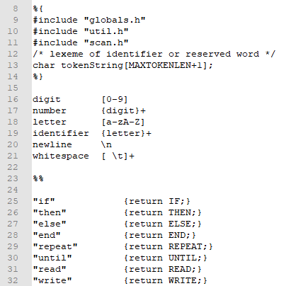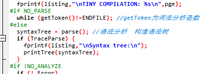 而在TINY词法分析中,使用flex工具之后输出生成的c语言代码是可以得到对应的getToken函数去替换TINY源码中的词法分析部分,编译器是依旧可以运行的。