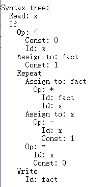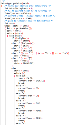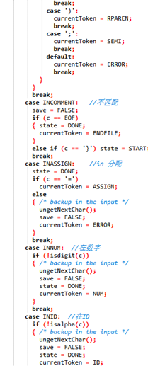 可以看到,getToken函数中有个state是用来表示当前输入缓存区的字符流是什么状态的,初始是START表示刚开始,当前字符串为空。于是在case START中,它需要根据当前拿到的字符char是什么而进入不同的状态,如isdigit()返回true的话就表示这个是个数字,那么进入INNUM状态,当该字符不在满足是isdigit()时,程序会执行ungetNextChar()函数,将当前审阅的字符返还会去,下次再识别(实际上就是指针linepos自减)完成一个回溯的流程。同样,当前符号是一个’=’时,状态为START,则会匹配进入case ‘=’中,是的当前的Token被设置成EQ,表示判等。这就是TINY词法分析做的工作。