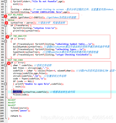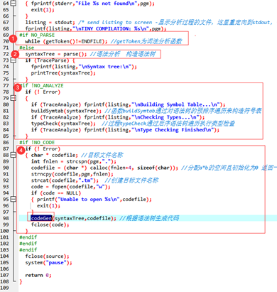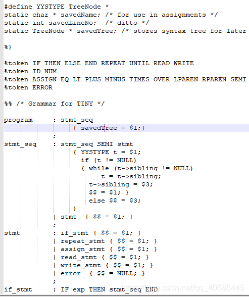 可以看出,main1函数中,1为词法分析,2为语法分析,是根据tiny.y(图4.2)生成的,也就是仅仅具有生成抽象语法树的动作的SDT生成的,即在此处得到的是一棵语法分析树,而之后的3是输出符号表等信息,而4就是代码生成,确切的说应该是目标代码生成,TINY语言的目标代码生成,当然,也可以认为该目标代码就是中间代码,因为其还需要在TM虚拟机上翻译运行。