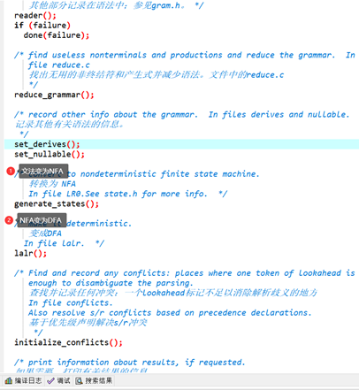查看main.c文件,然后对main函数进行分析,发现我们关注的上下文无关文法到DFA就是上图中的1 2 两点。