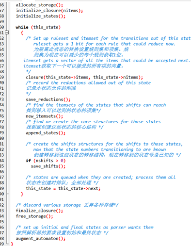 到此,文法->LR0(NFA)->LALR(DFA)的过程,其实关键是在产生LR0,之后加上follow向前看符合就可以变成LALR了。generate_states()产生lr(0)状态,generate_states()是个正向推导过程,根据语法文件,确认所有的可能。