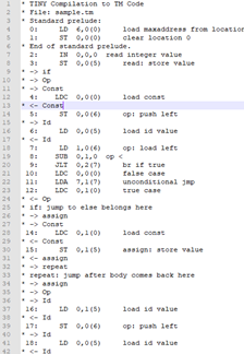 TM是运行tiny语言的运行程序xx.tm的虚拟机平台,是TINY语言编译器编译之后的汇编代码的运行环境。TM机的主要功能是将TM的汇编代码读入和执行,它具有一般计算机类似的精简指令级RISC。TM汇编语言和一般的Intel汇编语言差不多,包括寄存器寻址、操作符等。一条典型的代码如:LD 0,10(1),这里面10(1)就是寄存器1中地址为基址,10为偏移地址,寻址结果放入寄存器0。三目操作符:SUB 0,1,0表示将寄存器1和寄存器0的差值结果放入寄存器0。