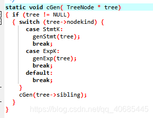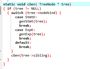 cGen函数就是主要的代码生成函数,生成的是类似于LD dst,addr , JEQ x,0(x) 的IR代码。根据语法分析树,是StmtKey 基本语句类型,还是ExpKey 表达式类型的结点,从而执行相应的代码生成代码。调用genStmt()函数会对基本语句进行生成并且会在里面递归调用cGen函数,记录基本语句如if、repeat的起始点和终止点,依照tiny文法来严格生成中间代码。