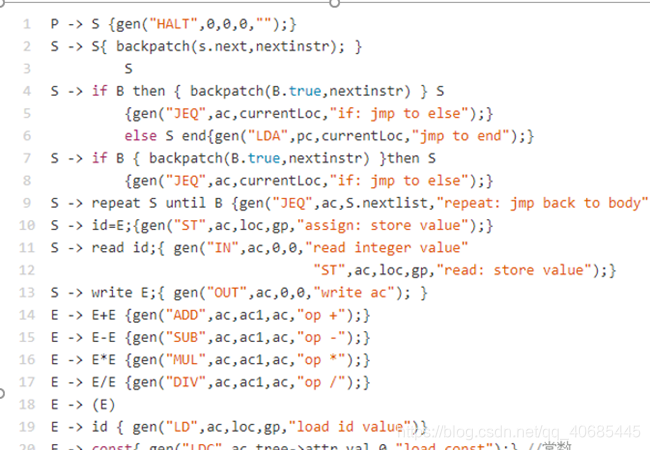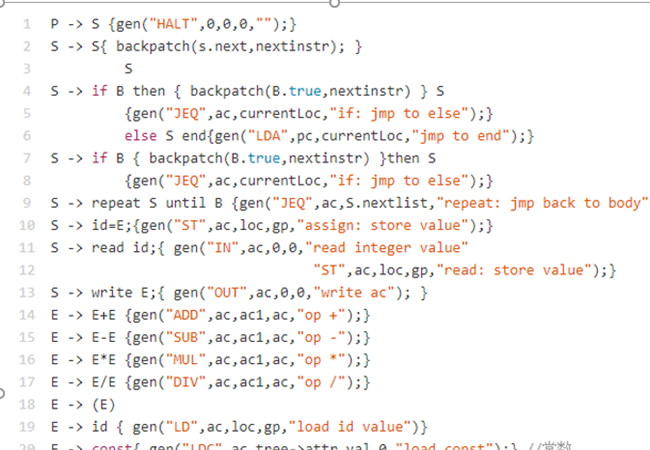 可以猜想到,该中间代码生成的代码程序cGen也是可以由bison工具针对特定的SDT作为输入而产生的,只是这个SDT并不是容易写出来的,但是可以猜想,如果熟悉这个TM的目标平台的代码格式的和对SDT的书写语法有所了解的话,是可以写出这个中间代码生成的SDT的,类似于下面的SDT。
