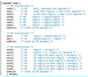 TM机的指令集并不复杂,RR instruction是表示两个寄存器之间的指令,包括加减乘除和输入输出,RM instruction则是指的是寄存器与内存之间进行操作的指令,包括加载和存储,而RA instruction则是跳转指令,涵盖了大于、小于、等于、大于等于、小于等于和不等于这些逻辑跳转指令,值得一提的是LDA a,b(c)指令是只将寄存器c的值作为地址偏移b位置后的地址赋值给a,而LDC a,b(c) 就是单纯的把b的值赋值给a,c是什么都没有关系。这也就是所谓的中间代码的规范了。tiny语言中间代码的规范准则。