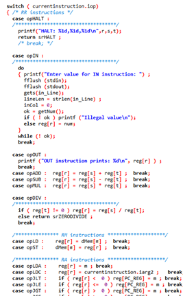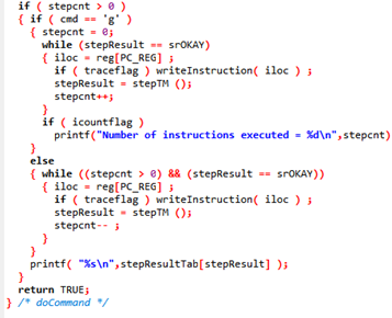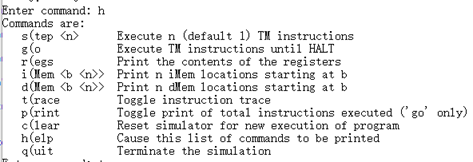 看了源码之后知道,TM机设置了八个寄存器分别由0-7进行编号,而命令r可以输出当前寄存器的使用情况,PC指令寄存器被设置为7号寄存器。图6.4中第一个while循环中的stepTM()是执行tm文件的核心代码,而writeInstruction()函数则是输出执行过程的每一条指令,将traceflag标记位设置为true则可在运行时看到运行时的执行信息。
