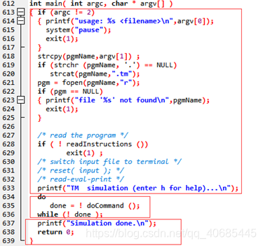 可以看到main中前面的框中的代码是读取文件,后面的是输出结束提示,主要核心程序就是中间这个框中的do-while代码,可以看到他就是在循环运行doCommand(),直到收到q命令,返回false使得程序循环结束。而我们经常使用的运行指令就是g,它会运行tm文件