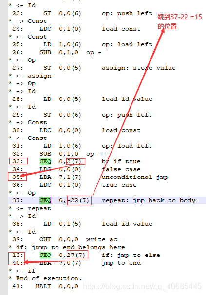 可以看到,在tm文件中的中间代码都在这里被得以执行,比如read指令翻译成的IN指令,会使得stepTM函数执行case opIN 然后再对控制台输入进行读取且对输入是否是数字进行判断。在比如,ADD 0,1,2指令,将会被执行case opADD ,将寄存器0与寄存器2的和放到寄存器1中进行存储。而对于跳转指令 JEQ 0,-10(7) 跳转指令的寄存器必须是7指令寄存器pc,因为跳转寻址是根据当前指令位置进行寻址的,如该指令这表示若寄存器0的值等于=则跳转到当前指令往上10条的指令位置。图6.6很好的说明了跳转指令的工作流程
