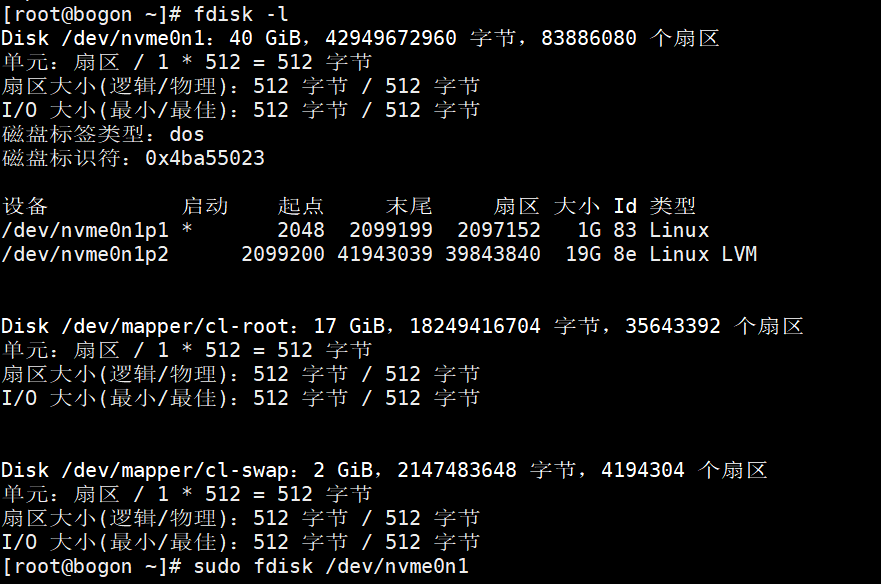 您的磁盘总容量为40GB,但目前只使用了20GB(1GB引导分区 + 19GB LVM分区),说明有20GB未分配空间。