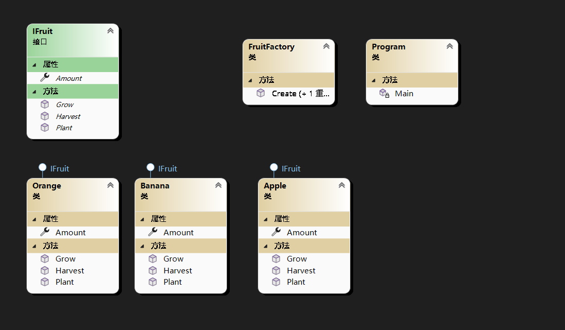 该模式中的问题,是如果要新加一种水果则要修工厂的代码会违背开闭原则,我们后面用抽象工厂方法将解决这个问题.