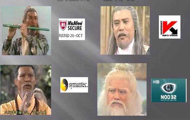 第一个是大蜘蛛,俄罗斯军方的(另外还有一个免费的,叫小蜘蛛);第二个是熊猫卫士;第三个也是俄罗斯的,卡巴斯基;下面两个分别是赛门铁克和麦咖啡。