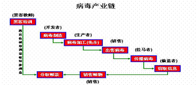 近年来全球病毒编写和制作者目的有了根本性改变,由“损人不利己”的炫耀个人技术转向以获取利益为主要目的地下组织。下图显示了这样子的一个产业链。