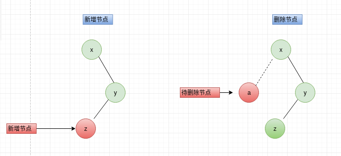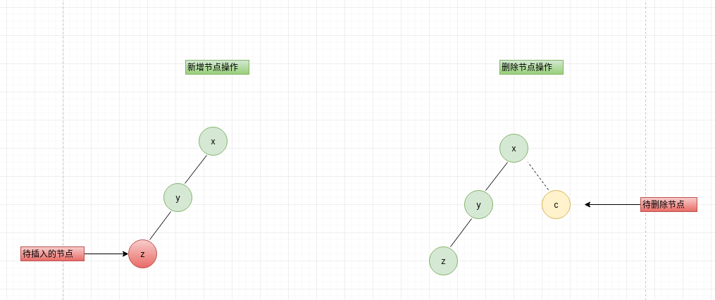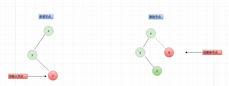 LR意思节点平衡因子大于1,且节点左孩子的平衡因子小于0,新增、删除节点时形成如下图x-->y-->z,需左旋再右旋