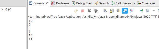 public class AvlTree<T extends Comparable<T>> { class Node{ T t; Node left; Node right; int height; public Node(T t) { this.t=t; height=1; left=null; right=null; } } private Node root; //获取节点高度 public int getHeight(Node current) { if(current==null) { return 0; } return current.height; } //获取节点平衡因子 public int getBalanceFactor(Node current) { if(current==null) { return 0; } return getHeight(current.left)-getHeight(current.right); } //前序遍历 public void preTraversal(Node current) { if(current!=null) { System.out.println(current.t); preTraversal(current.left); preTraversal(current.right); } } //判断是否是平衡二叉树 public boolean isBalanced(Node current) { if(current==null) { return true; } int balanceFactory=Math.abs(getBalanceFactor(current)); if(balanceFactory>1) { return false; } return isBalanced(current.left)&&isBalanced(current.right); } }