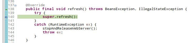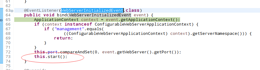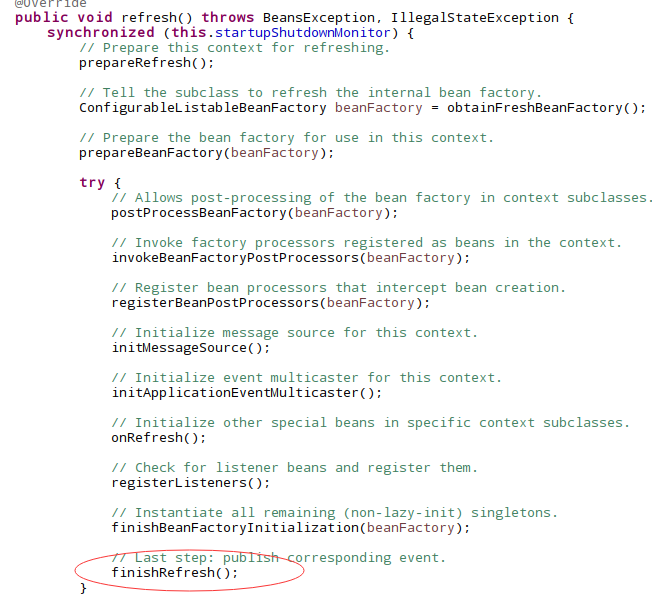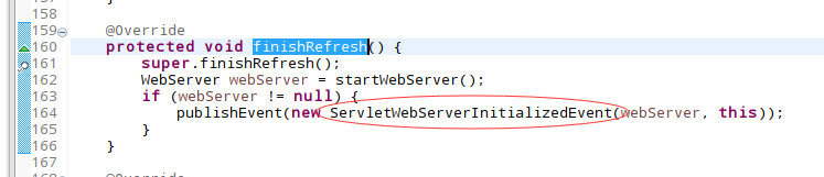 因为子类ServletWebServerApplicationContext重写了finishRefresh()方法,接着调用finishRefresh方法,注意此次调用监听器发布ServletWebServerInitializedEvent事件,