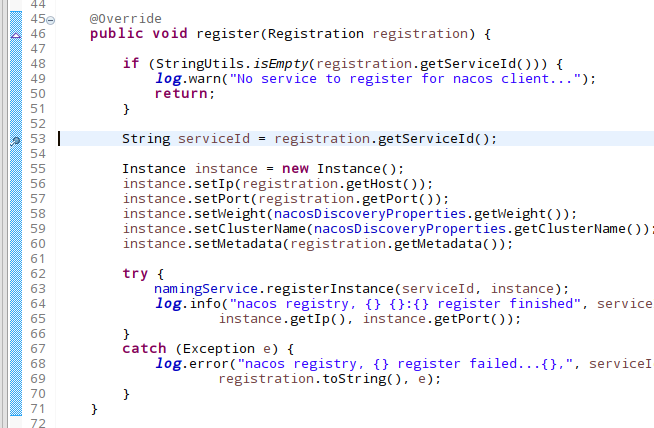 跳过一部分代码,接着调用NacosServiceRegistry的registy(),服务基本信息都拿到