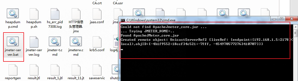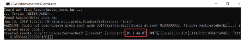 2. 在agent机上双击 jmeter-server.bat ,这个 ip 有用,待会要配到 controller 机器上的配置文件里(若报错'jmeter' is not recognized,需要配置 jmeter 环境变量)