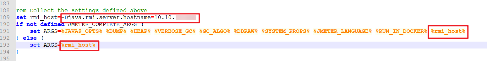 - 在控制机上编辑jmeter.bat文件,按照如下图所示修改,其中set rmi_host=-Djava.rmi.server.hostname=控制机的ip